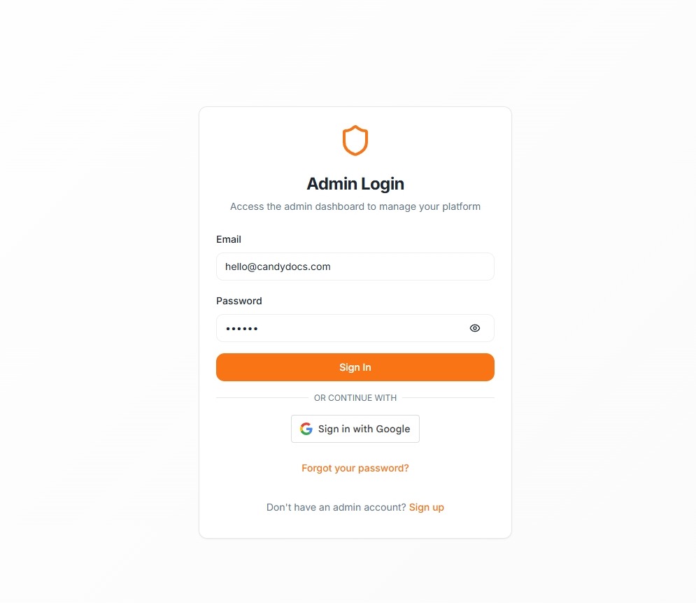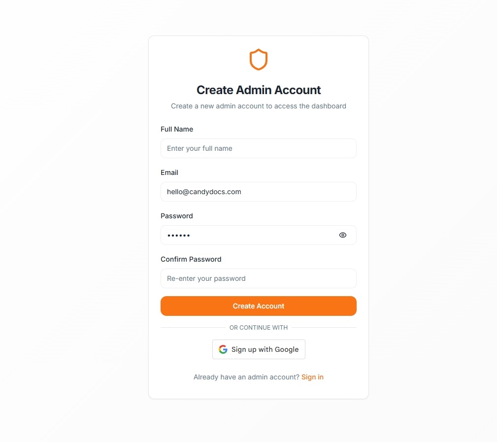 Welcome to CandyDocs! The first step to launching your documentation portal is creating your admin account.
